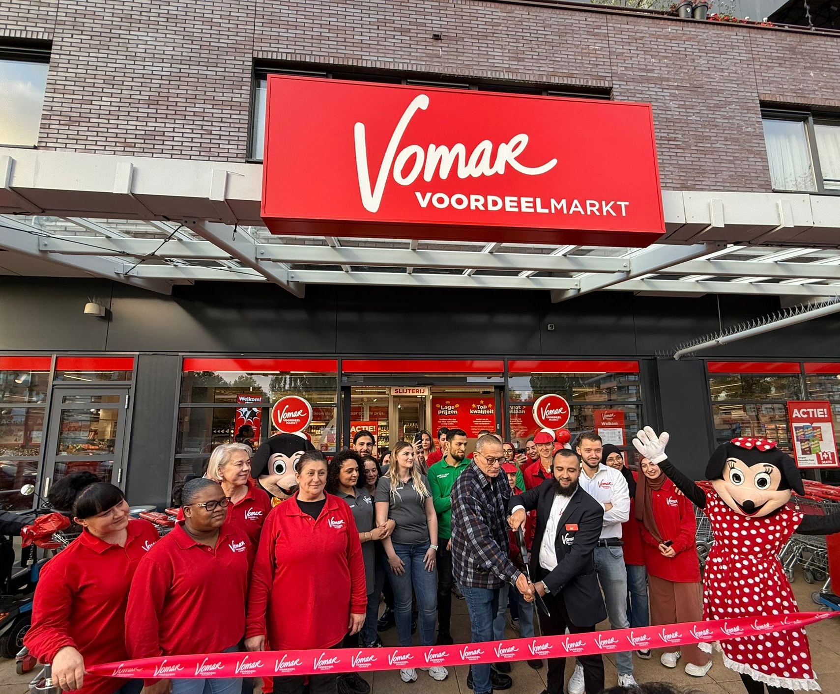 Zondag 12 oktober is de vernieuwde Vomar Voordeelmarkt Geuzenpoort in Amsterdam feestelijk geopend. Vele belangstellende klanten zagen hoe Supermarktmanager Younes samen met zijn team de opening verrichtte.