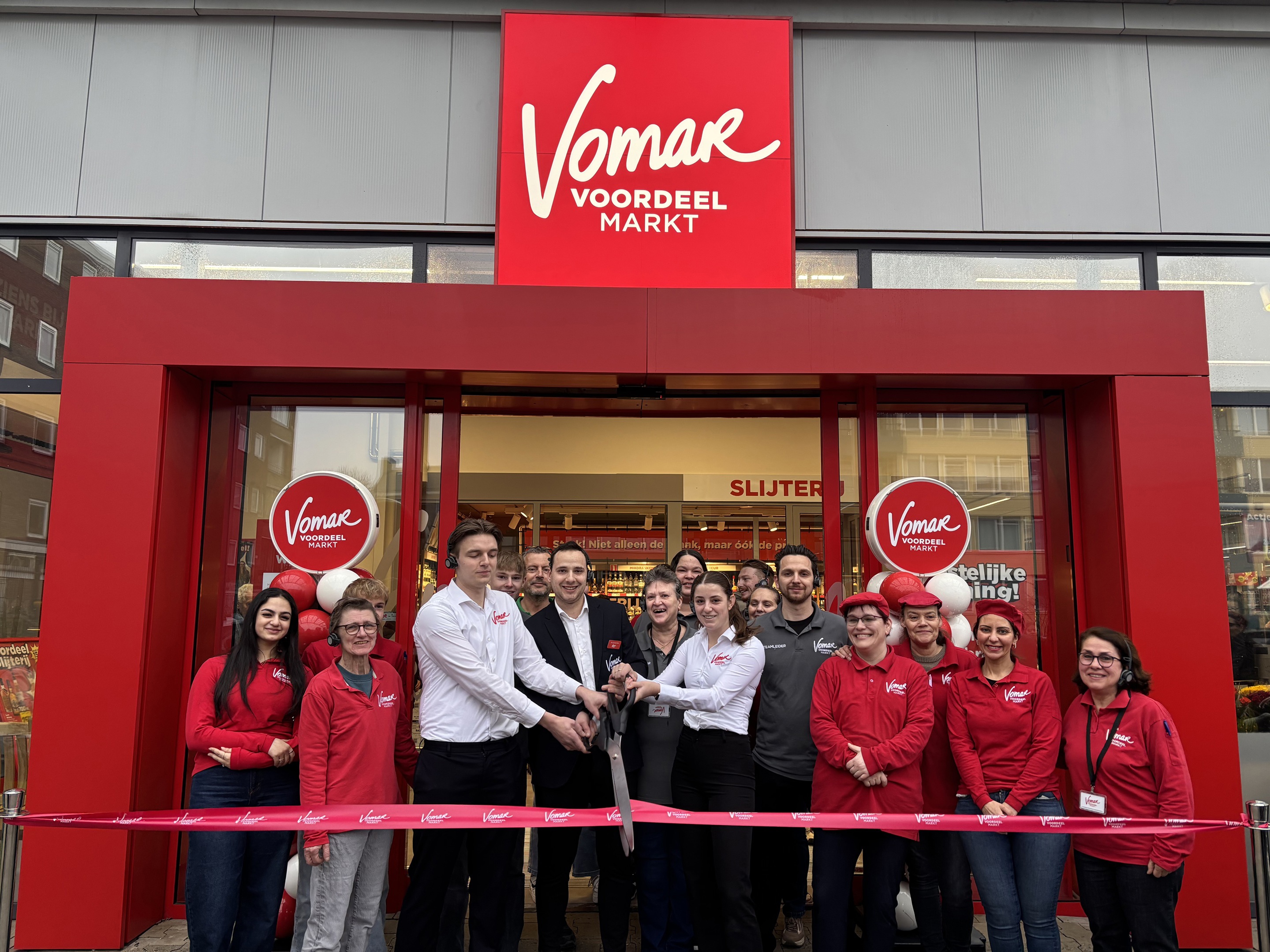 Woensdag 11 februari is de vernieuwde Vomar Voordeelmarkt aan het Kooimanplein in Purmerend geopend. Vele belangstellende klanten zagen hoe Supermarktmanager Thom samen met zijn team de opening verrichtte.