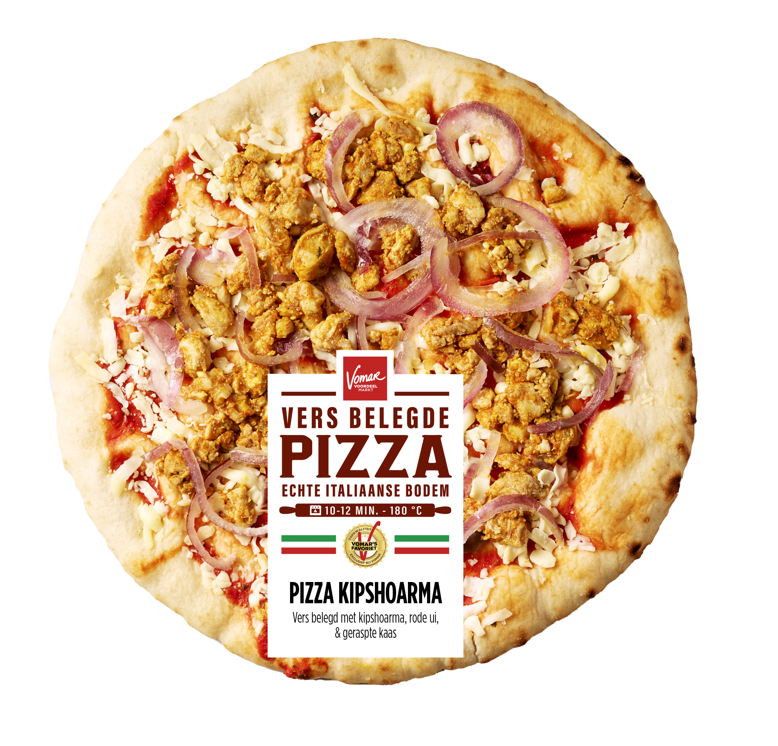 PIZZA KIPSHOARMA. Belegd met kipshoarma, mozzarella en rode ui